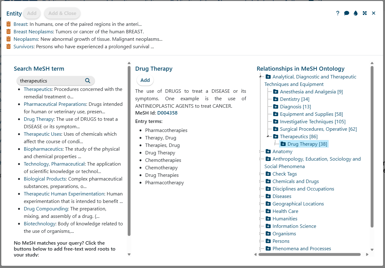 MeSH Thesaurus Integration: You define your study using biomedical concepts rather than just keywords. By integrating the MeSH thesaurus (Medical Subject Headings), the system automatically accounts for the various names and acronyms of a biological entity.