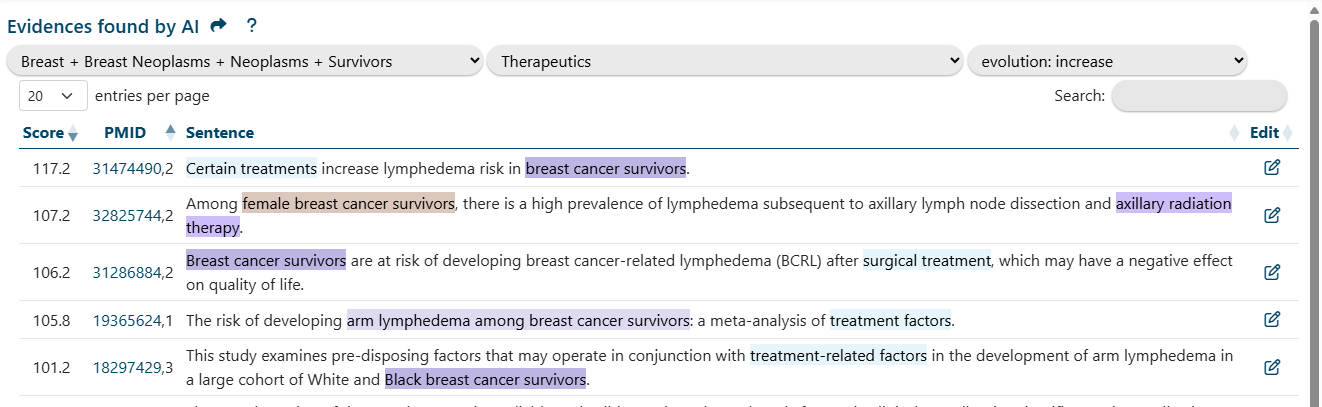To limit resource costs, the table is restricted to the first 1,000 publications most relevant to your study. The more entities your study contains, the better the algorithm ranks the sentences. You can add new entities, even with a low weighting factor. The system for relationship extraction is currently experimental. Since we lack sufficient manual annotations to train more efficient AI models, we invite your help. Please contribute annotations by clicking a button at the end of each line.