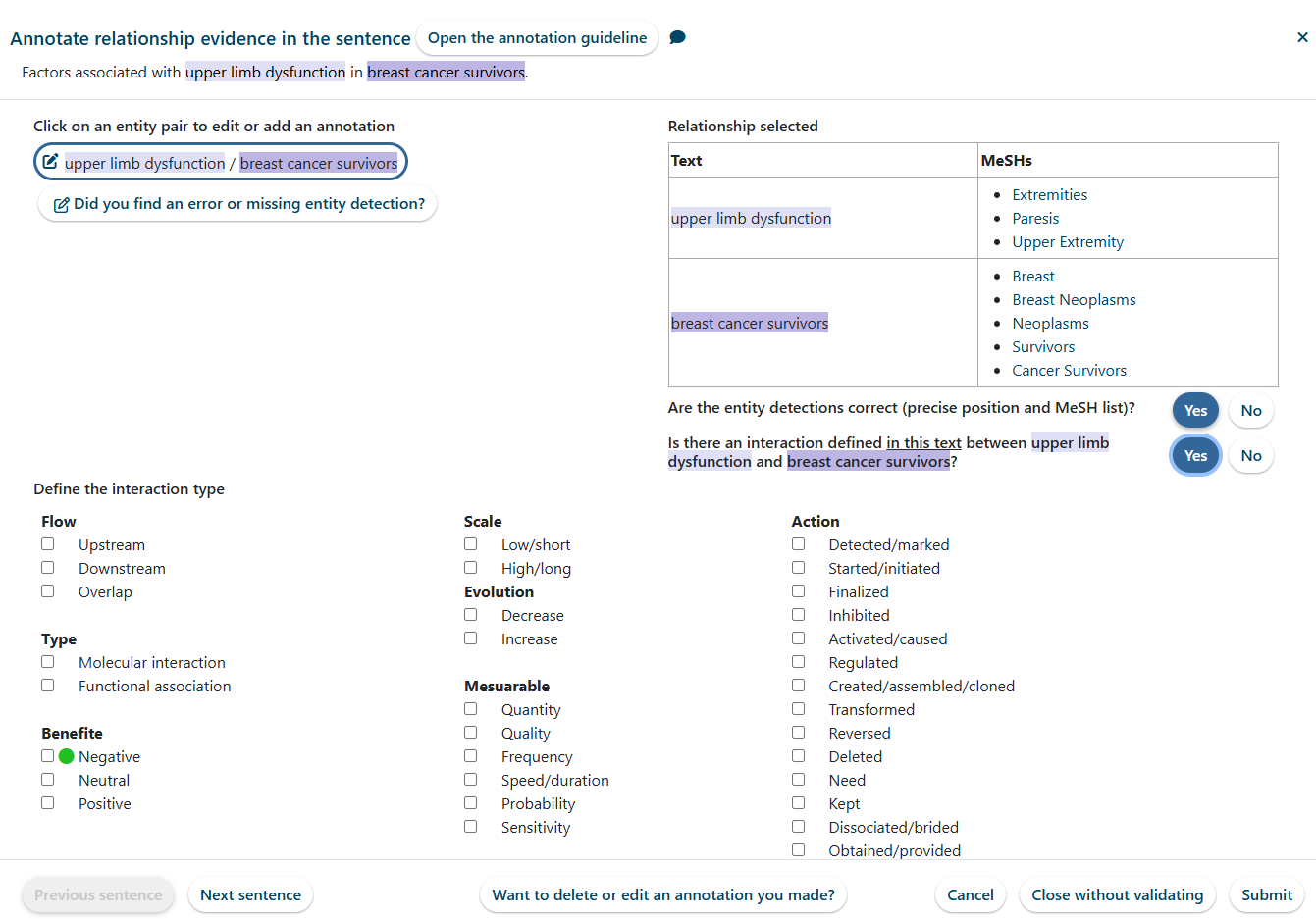 Click Submit to remove the relationship evidence for this entity pair in the text