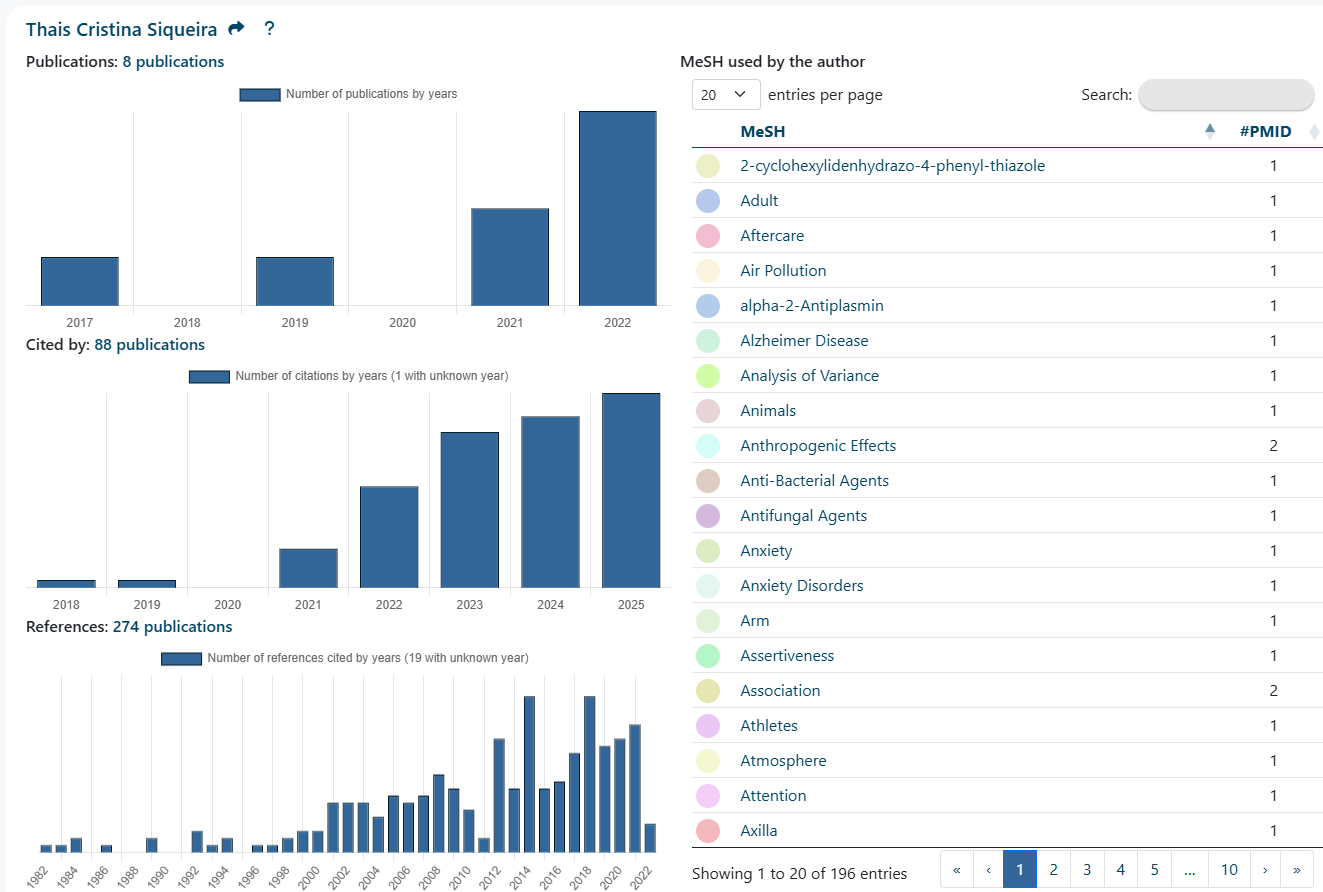 Author Profile: The dedicated author page features three insightful histograms: one detailing the author's publications, one showing publications that cite the author, and one displaying all references utilized. Additionally, a table provides a complete list of MeSH terms used by the author.