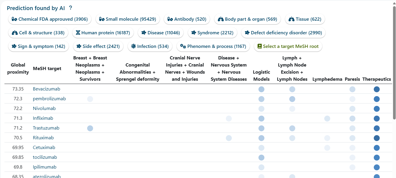 Custom Prediction: You can select from a list of predefined targets or build your own list from the MeSH tree to find which MeSH targets are most relevant to your study.